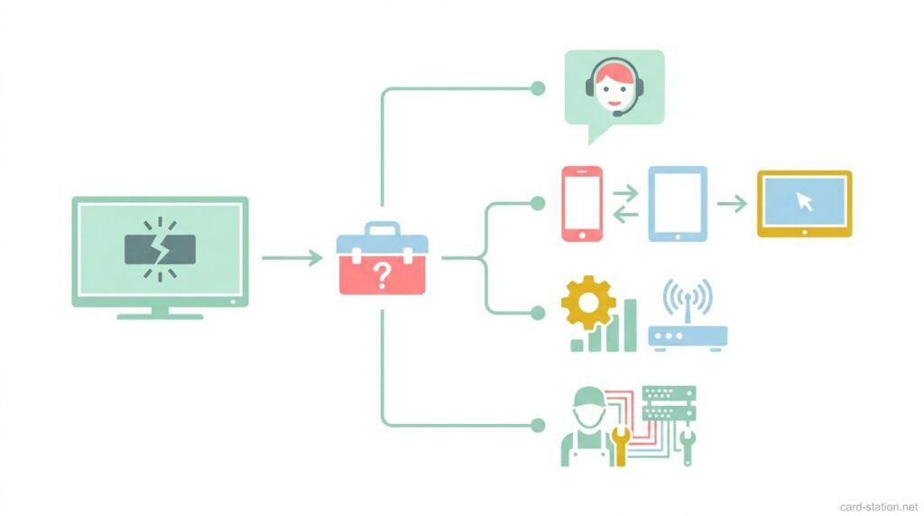 別の端末では正常に接続できる場合は、元の端末側に原因があると判断できます。どの端末でも同じエラーが出る場合は、接続先のテレビやネットワーク側に原因があると切り分けできます。
