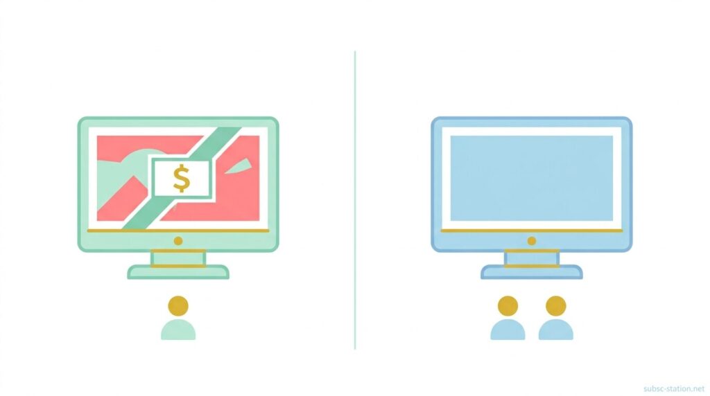 この2つのプランは、画質や同時視聴数は同じですが、「広告の有無」と「使える機能の範囲」で体験が大きく変わります。