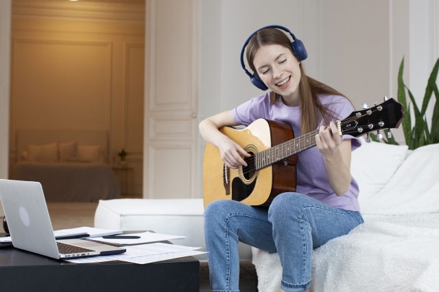 - 視覚と聴覚を駆使した学習: 多くのオンライン音楽レッスンは、視覚的に学ぶツールや、耳で学ぶツールを組み合わせて提供しています。例えば、オンラインプラットフォームによっては、楽譜やタブ譜を使って視覚的に学習できる機能や、リズムやメロディを聴いて覚えるための練習問題が提供されています。これにより、視覚と聴覚を組み合わせた多面的な学習が可能となり、効率的に音楽を習得できます。