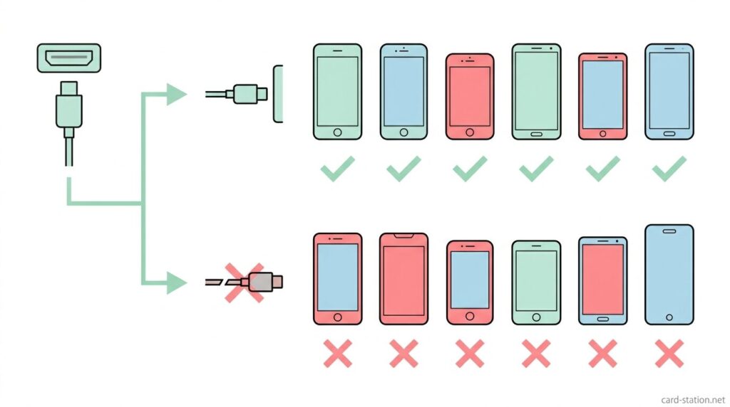 実は、有線接続で映るかどうかはスマホの機種や対応状況によって変わります。同じUSB-Cでも映像出力に対応していないと表示されないため、事前の確認が大切です。